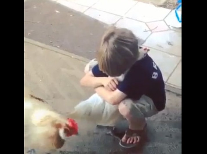 Garoto dá abraço emocionando em galinha e ela retribui