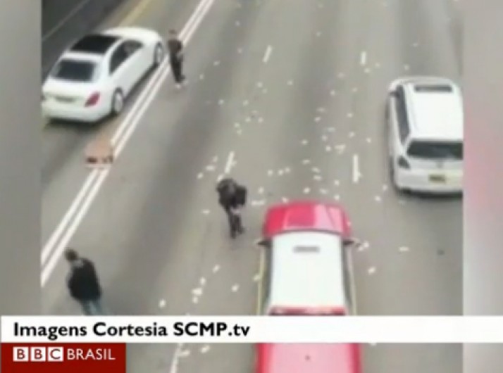 Pedestres se apressam para apanhar dinheiro que caiu de carro forte