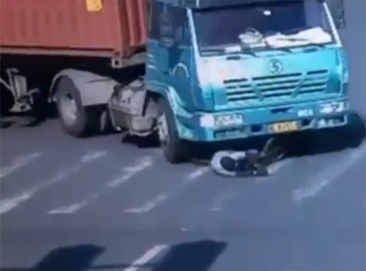 Ciclista só sofre arranhões após ser atropelado por caminhão na China