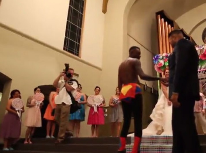De cueca e patins, rapaz entrega alianças em casamento