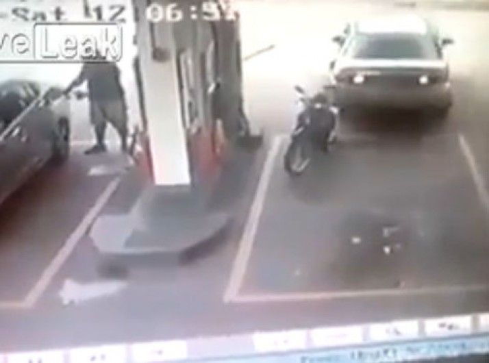 Motorista nervosinho derruba moto de propósito em posto