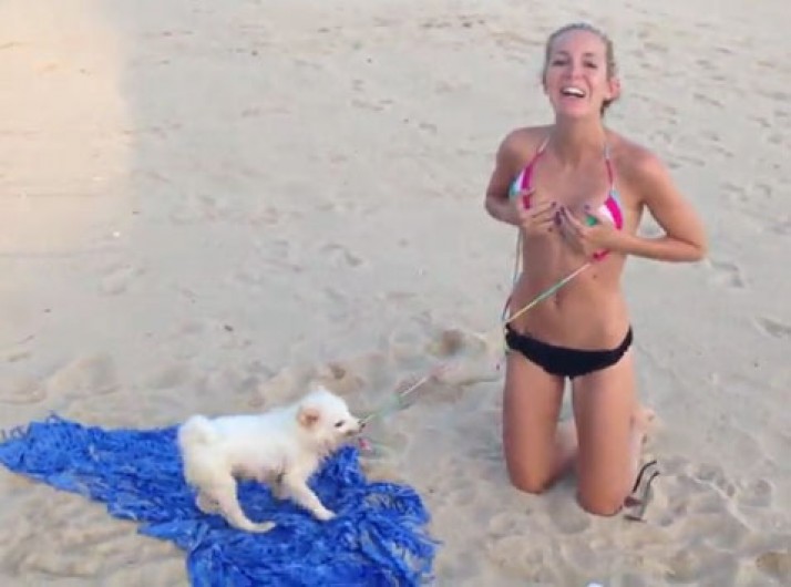 Cãozinho sapeca tenta tirar biquíni da cantora americana Kendra Moriah