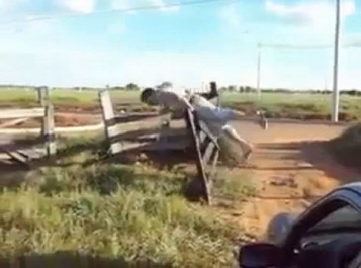 Homem mostra como abrir uma porteira do pior jeito possível