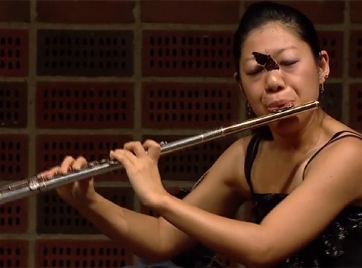 Concentração total: nem borboleta atrapalha flautista