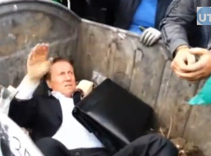 Manifestantes cercam deputado ucraniano e o jogam em lata de lixo