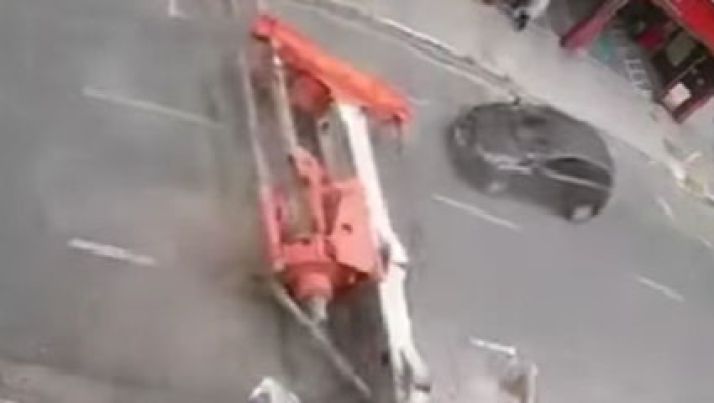 Carro quase é atingido por guindaste de obra que caiu em rua de São Paulo; veja