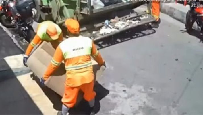 Mulher lava sofá, deixa na calçada, mas caminhão do lixo passa e leva embora; veja