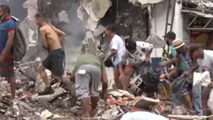 Após incêndio em supermercado, moradores buscam alimento entre entulhos
