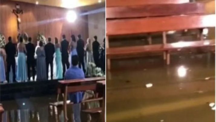 Noivos se casam em igreja alagada: "Tinha até peixe no sapato"