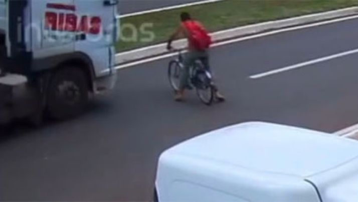 Ciclista distraído tenta atravessar rua sem olhar e é atingido por caminhão
