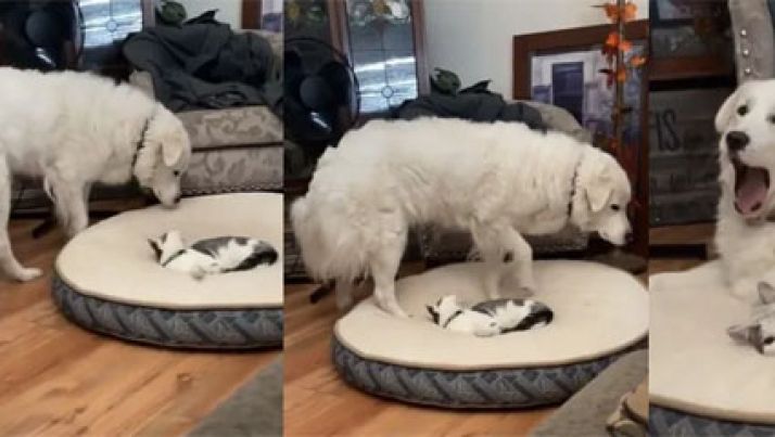 Reação engraçada de gata ao ser 'esmagada' por cachorro viraliza; veja