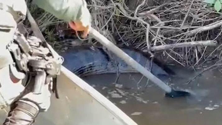 Sucuri de 5 metros fica enroscada em rio após ingerir presa grande em MS