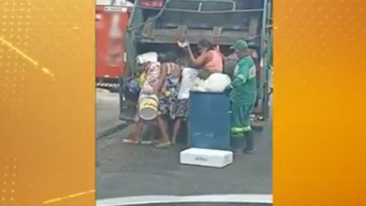Pessoas buscam comida no lixo: alimentos já estavam no caminhão de coleta