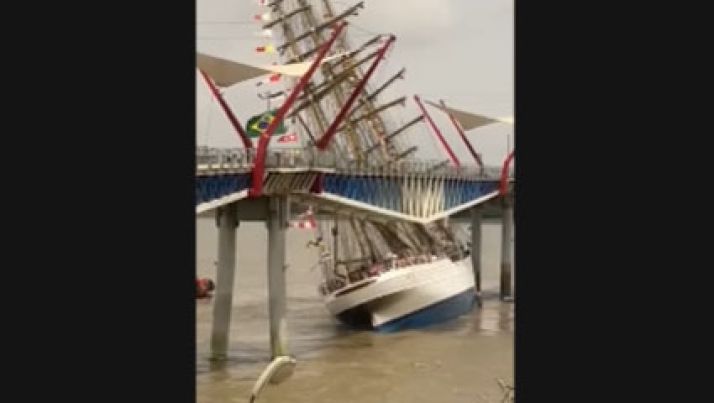 Navio da Marinha brasileira bate em ponte no Equador; veja o momento