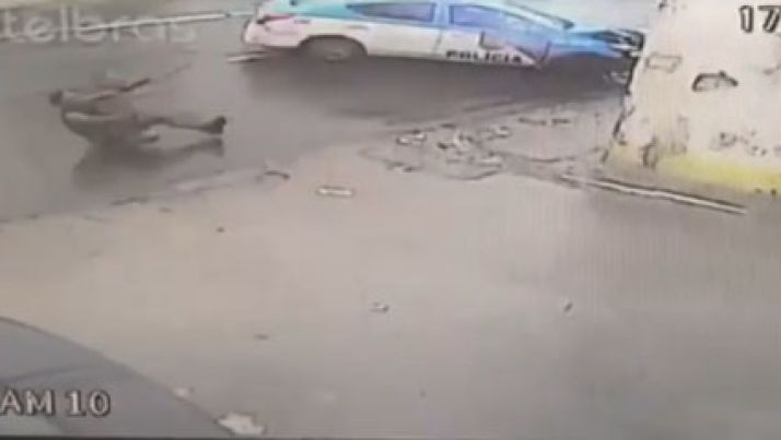 Suspeito é arremessado após colisão entre viatura da PM e moto; veja