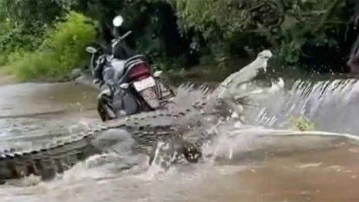 Durante trilha, homem registra imenso crocodilo cruzando rio; veja