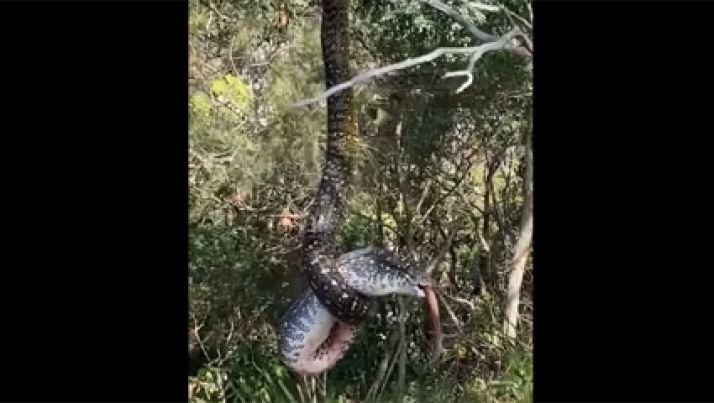 Vídeo mostra cobra pendurada em árvore na praia e engolindo gambá inteiro