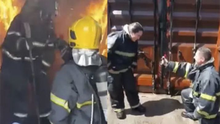 Bombeiro pede namorada em casamento em meio às chamas dentro de container; veja