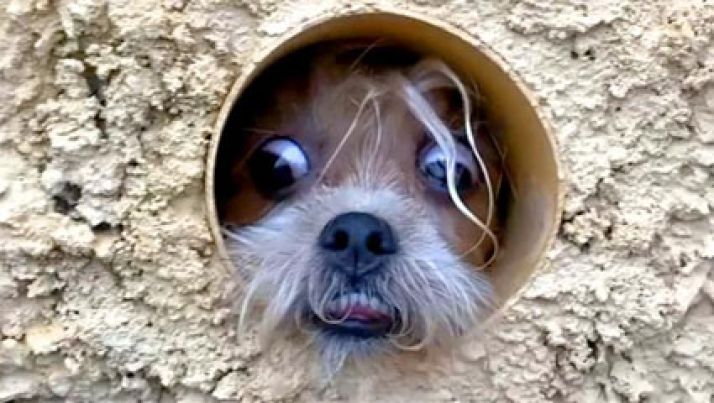 Cachorra enfia cabeça em cano para espiar a rua e viraliza; veja