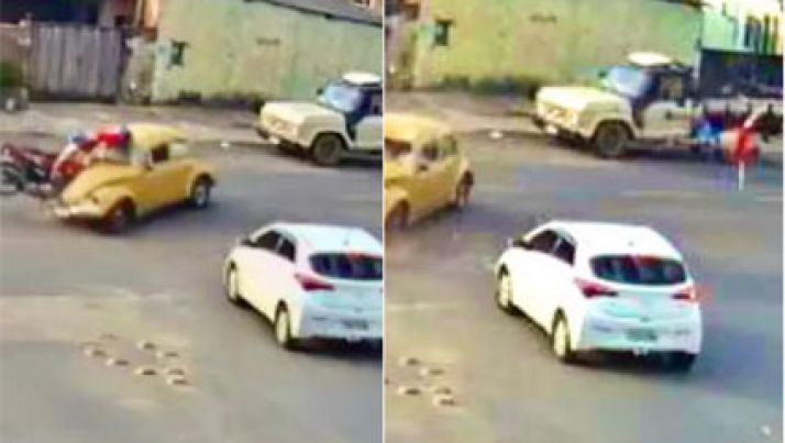 Acidente grave: motociclista gira no ar após ser atingido por um fusca que estava na contramão