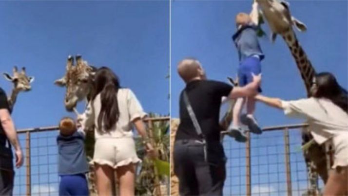 Susto! criança tenta alimentar girafa e fica pendurada no ar; veja