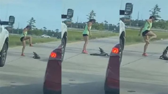Jacaré atravessa rua e pedestre mulher trava luta para retirá-lo com o pé; veja