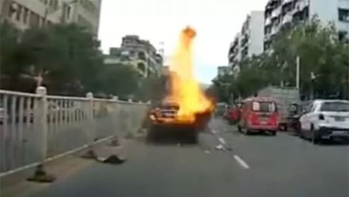Na China, carro pega fogo e explode várias vezes no meio do trânsito; veja