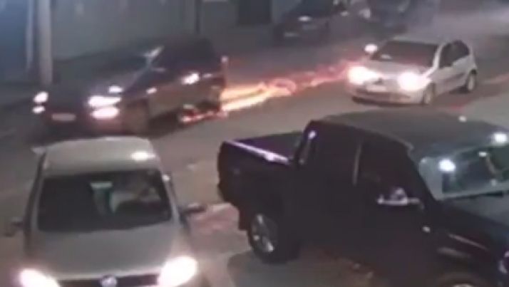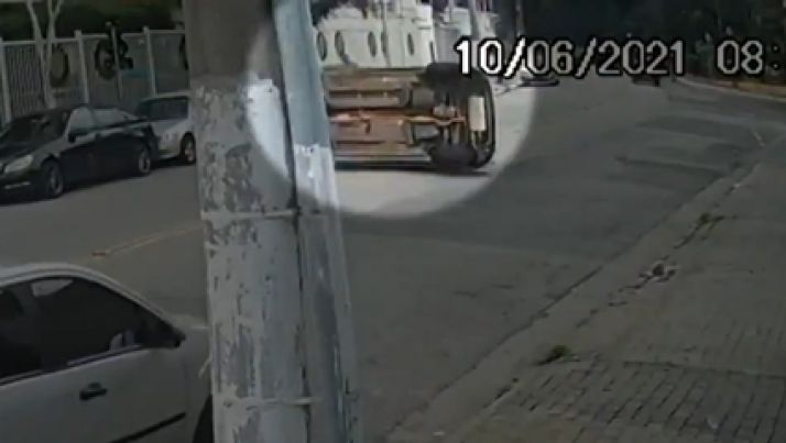 Câmera flagra motorista batendo em carro estacionado e capotando.