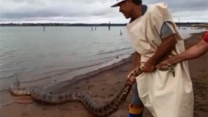 Vídeo mostra sucuri de 5 metros passeando às margens de rio no interior de SP