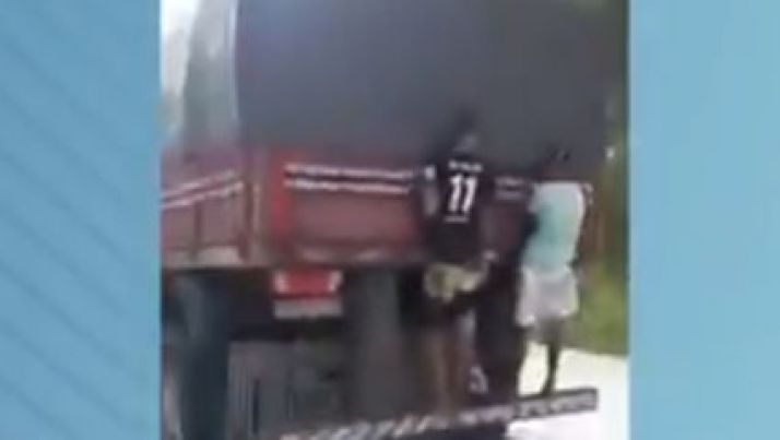 Jovens são flagrados pegando "rabeira" de caminhão em alta velocidade; veja