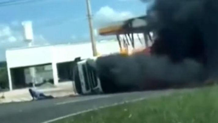 Motorista se arrasta para sair de caminhão em chamas que tombou em Goiânia; veja