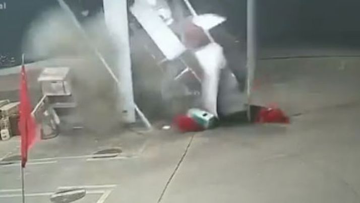 Caminhoneiro dorme ao volante, bate e destrói uma bomba de gasolina; veja