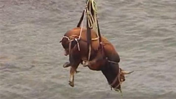 Vídeo mostra touro de 800 kg sendo resgatado por helicóptero em praia espanhola