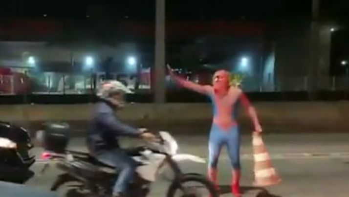 Jovem faz sucesso vestido de homem-aranha após ter carro batido em avenida; veja