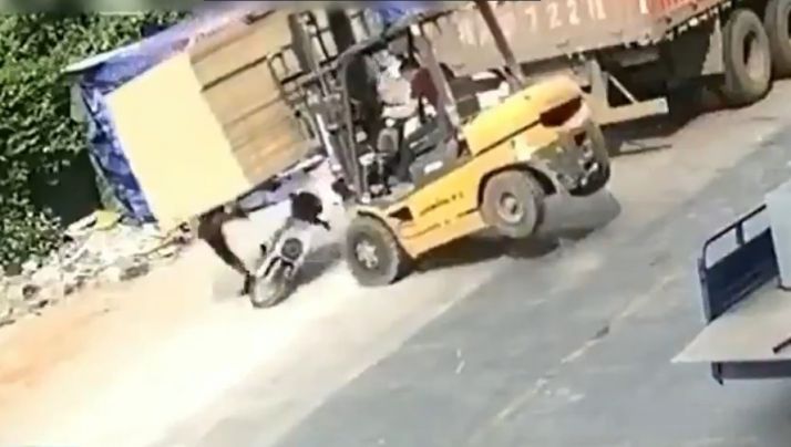 Motociclista age rápido e escapa de ser esmagado por causa de empilhadeira