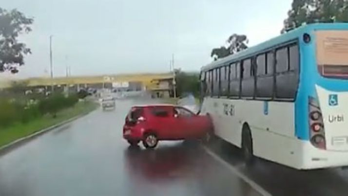 Motorista perde o controle do carro, derrapa na pista e bate em ônibus; veja