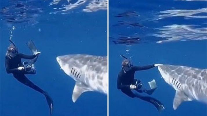 Bióloga desvia tubarão-tigre com toque suave no nariz do animal; veja