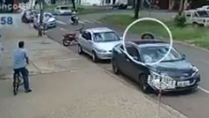 Roda de caminhonete se solta, cruza avenida e quase atinge motociclista; veja