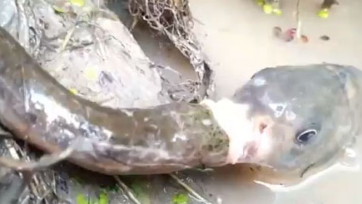 Peixe romantiza, tenta engolir cobra por inteira e não consegue; veja