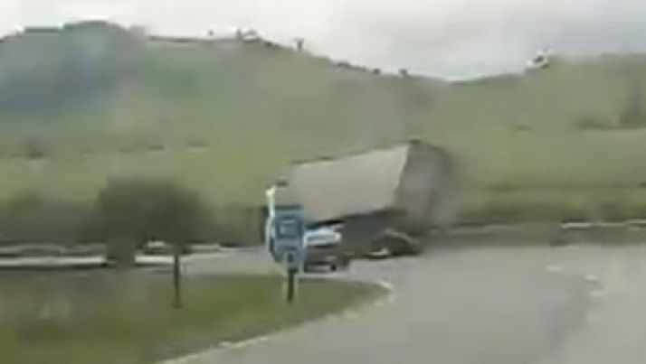 Carreta tomba enquanto fazia curva e quase atinge carro que vinha ao lado; veja