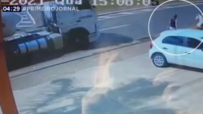 Impressionante! Caminhão tomba e quase acerta pedestre no Rio Grande do Sul; veja