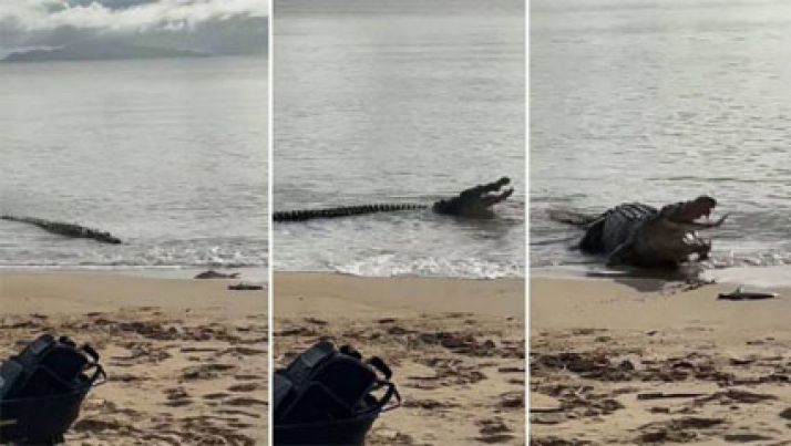 Crocodilo gigante aparece em praia e devora filhote de tubarão encalhado; veja