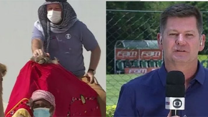 Repórter sobe em dromedário, rasga calça e passa perrengue ao vivo na TV
