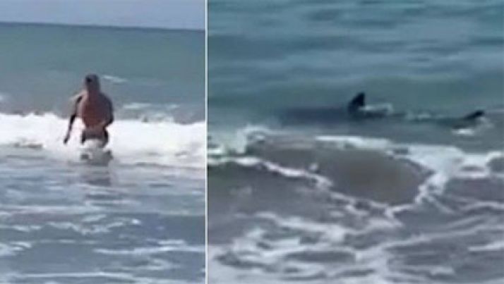 Homem corre e escapa por pouco de dois tubarões em praia; banhistas gritaram