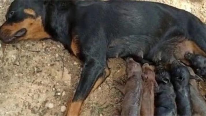 Cadela ‘adota’ e amamenta oito porquinhos que perderam a mãe; veja
