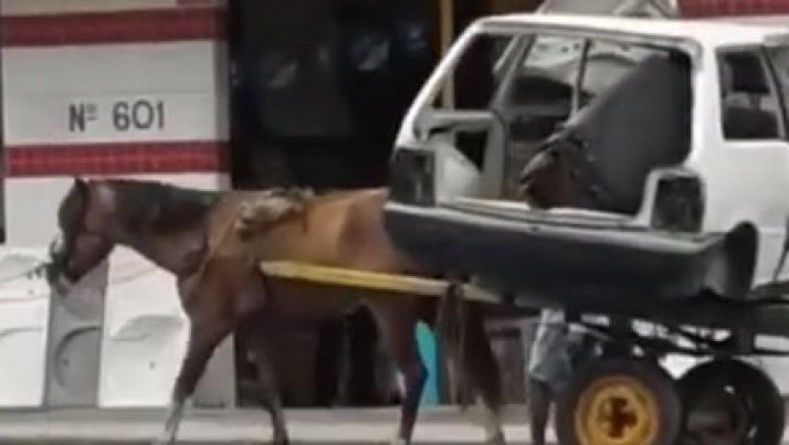 Vídeo mostra cavalo puxando carroça com carcaça de carro em Maceió