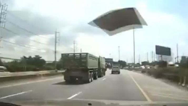 Carro é atingido por placa de metal; motorista teve o para-brisa destruído; veja