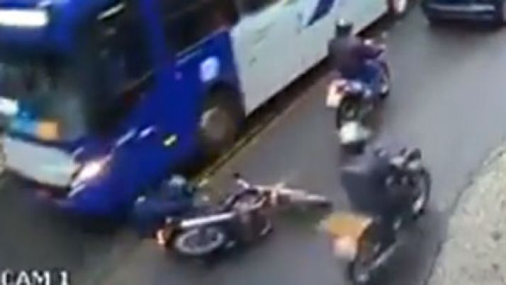 Motociclista se desequilibra e bate a cabeça na roda de ônibus, mas escapa de acidente fatal