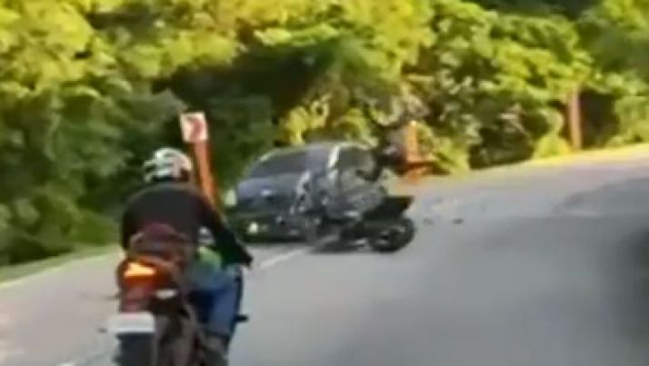 Motociclista em alta velocidade invade contramão da estrada e causa acidente grave