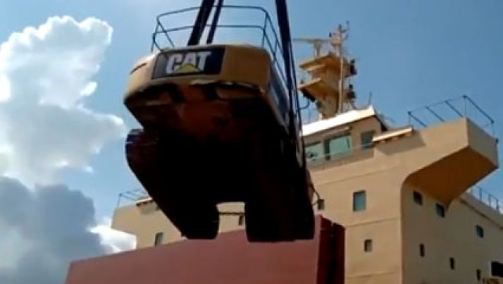 Escavadeira despenca de guindaste quando estava sendo colocada em navio em porto